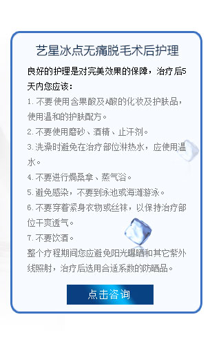 采用独特的冷冻保护,克服了早期脱毛冷触彩光副作用大,以及表皮损伤等缺点。同时不损伤周边组织,痛感轻微,是目前、快捷、长久的去毛技术。 飞顿冰点脱毛在风靡冰点飞顿脱毛的冰点脱毛基本上,收缩毛孔、紧致提亮肌肤技术,是以色列飞顿激光在2010年夏天提出针对激光脱毛市场的医学美容项目。飞顿冰点脱毛通过激光、光学技术,将冰点脱毛、收缩毛孔、提亮紧致肌肤集于一体,患者使用飞顿冰点脱毛,不仅能去除身上多余毛发,还能收缩毛孔,让脱毛后的肌肤细腻亮白...了解详情!